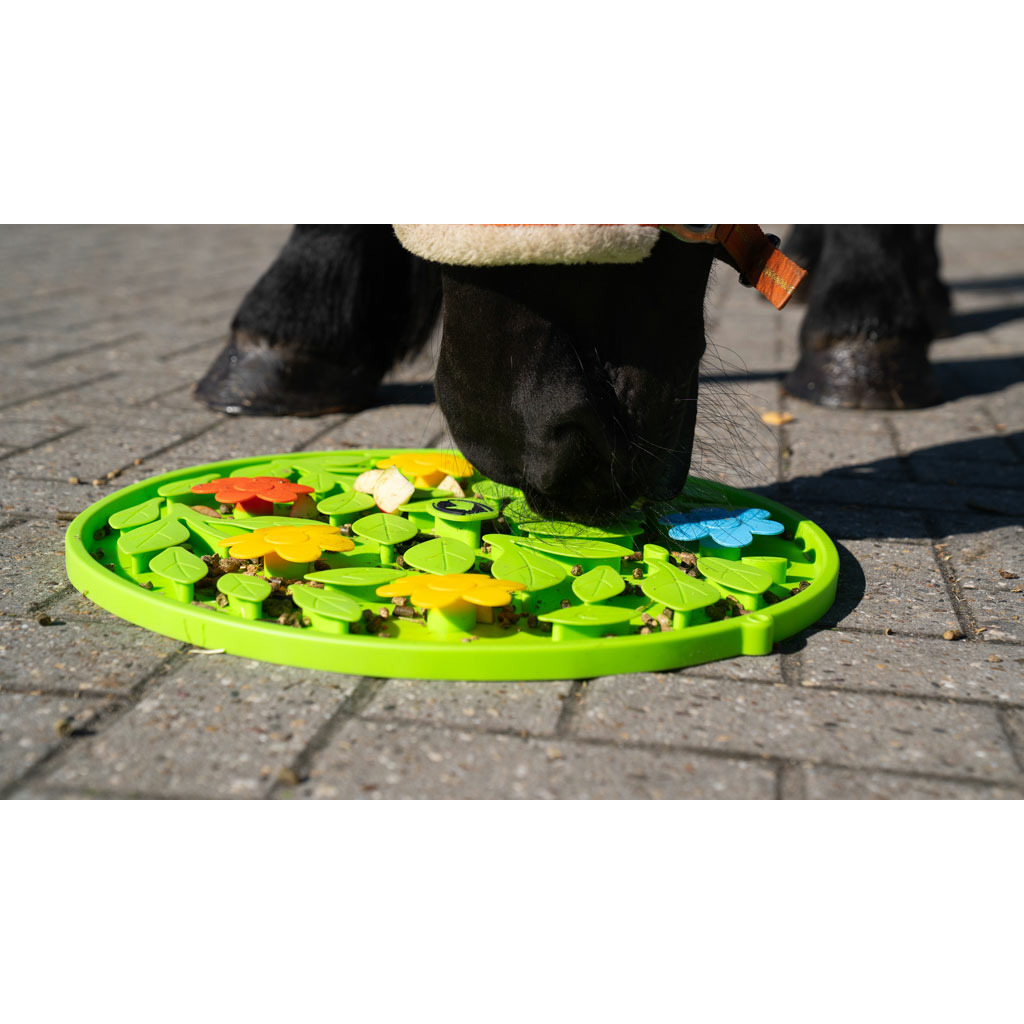 De Excellent Horse snuffelmat is ontwikkeld om paarden en pony’s uit te dagen! Deze mat stimuleert het natuurlijke foerageergedrag (snuffelgedrag) van paarden, doordat ze moeite moeten doen om al het lekkers van de mat af te eten. Ideaal inzetbaar om verveling tegen te gaan of om paarden te belonen op speelse wijze. De mat is gemaakt van zacht siliconen en daardoor ook geschikt voor gevoelige paardenneuzen.